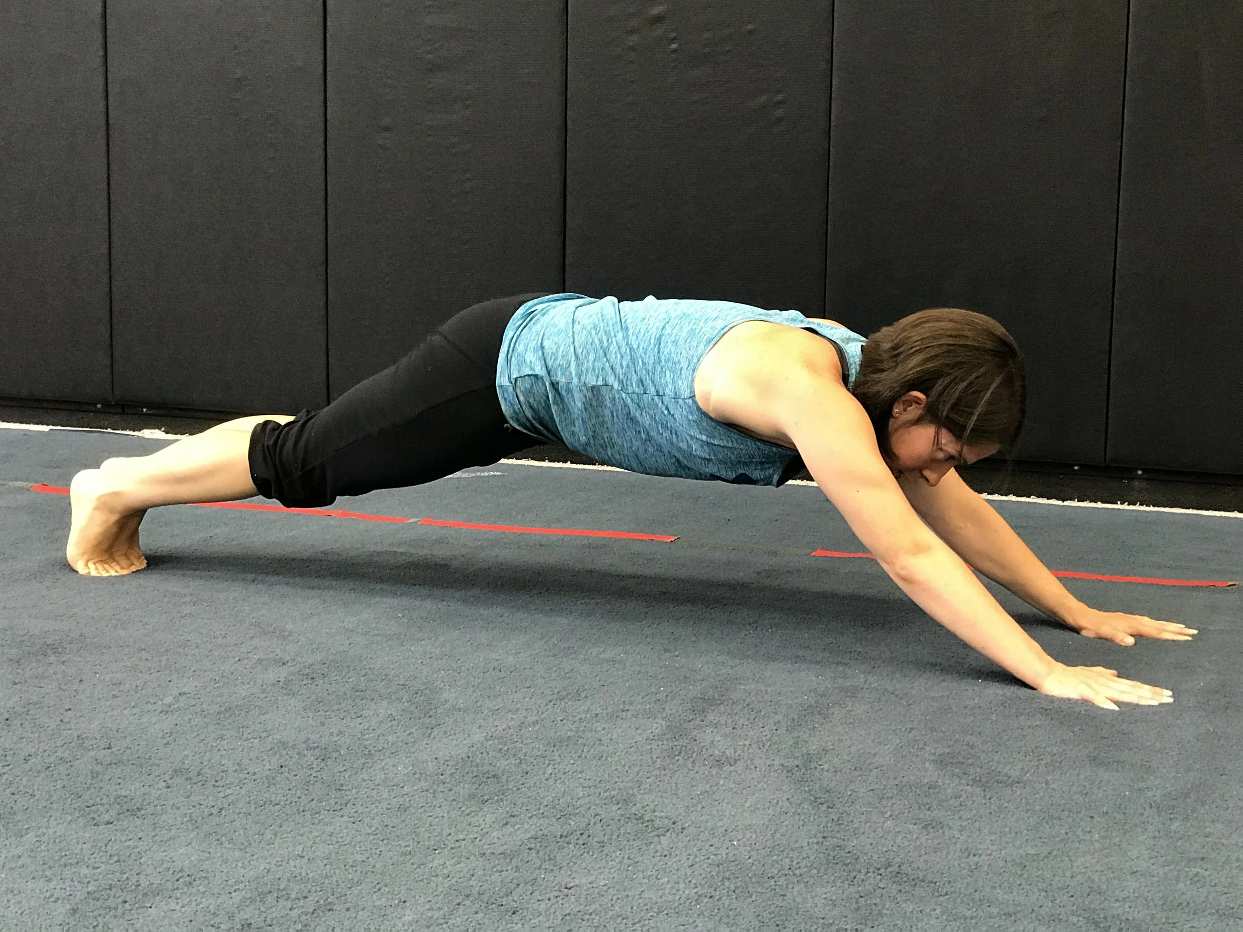 Hollow body hold: aka. The extended plank. This is ideal for those that find the plank hold easy and are looking to increase their core strength for inversions, tumbling or other acrobatic pursuits. Be sure to keep the back flat (no sway-back/arching) and the head neutral. Dosage is the same as the above plank, but be sure to start at a lower hold time when progressing to this variation from the regular plank!