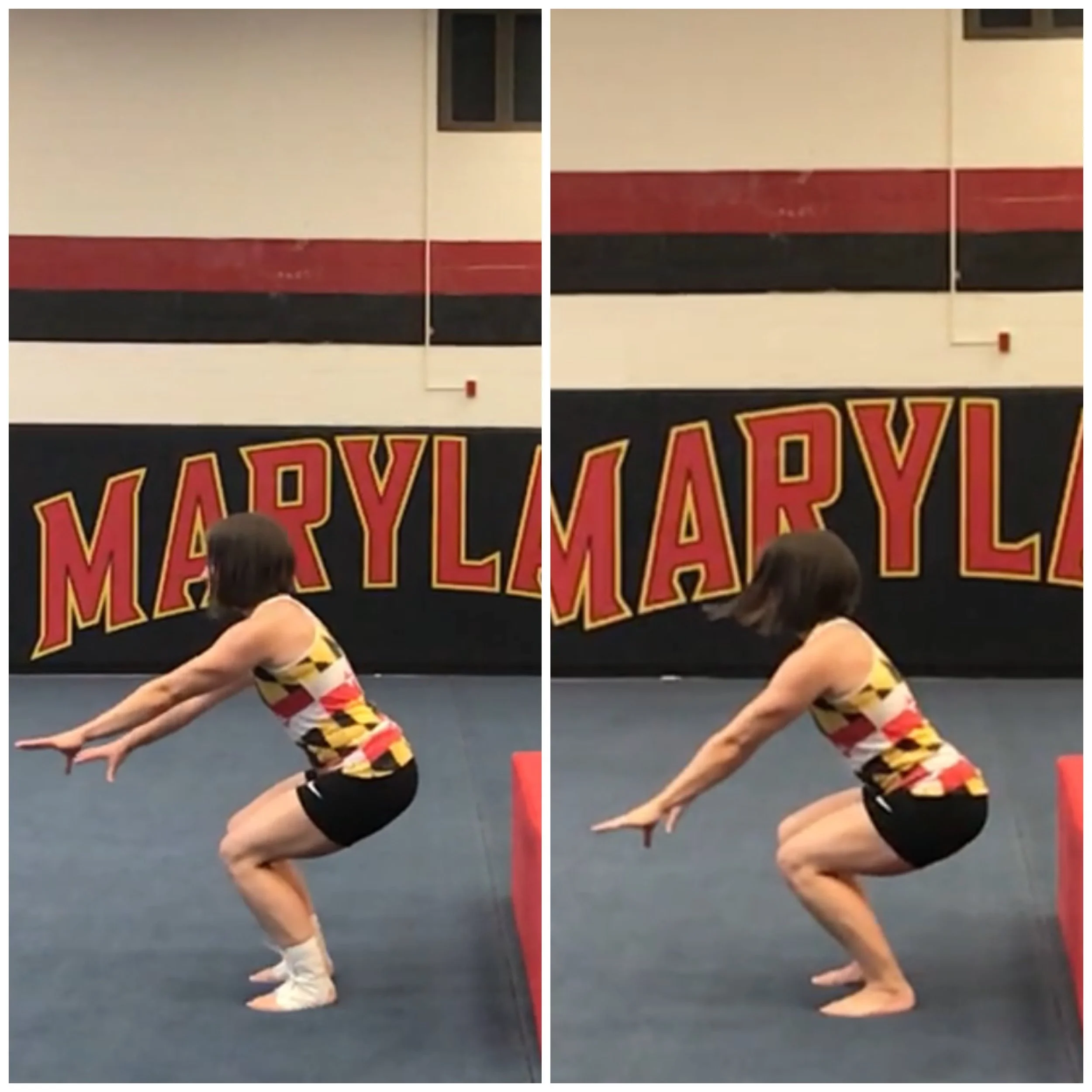 While this forward weight shift (and lift of the heels) may decrease ground forces on the above joints, it increases the stress on the quadriceps and the patellar tendons. Since the knees are now in front of the toes, the shear on both structures increases. (This is hypothesized as the reason why gymnasts/acrobats in ankle braces develop chronic anterior knee pain.) It also represents a variation that alters the motion and is not as consistent a way to land. When the weight rocks forward onto the balls of the feet, there is less surface area in contact with the ground. Add in a soft landing mat, or a short landing and the gymnast has less ability to correct when the heel is raised.